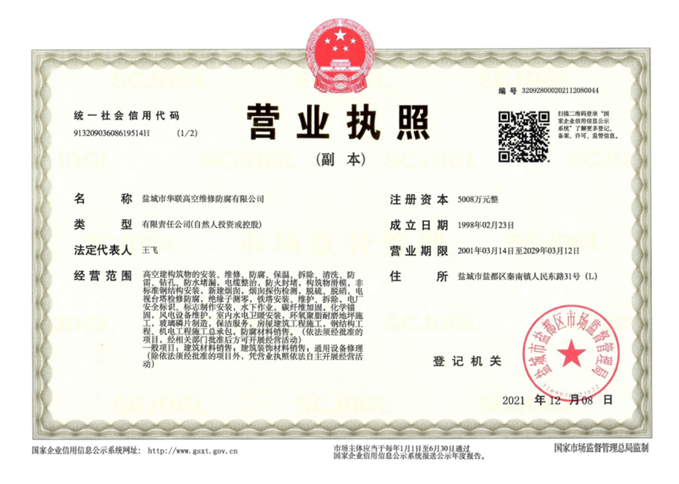 鹽城市華聯高空維修防腐有限公司始建于上世紀八十年代,系專業從事風力發電機塔筒防腐,塔筒維護,塔筒補漆,塔筒噴字等工程。不停產,不搭手架,高空懸吊施工的一級高空安全資質、一級高空防腐施工資質、二級建筑施工資質的高空建修、防腐工程、公司。現已發展集科研、設計、施工為一體的的江蘇省較大的高空建修,高空防腐施工企業;公司注冊資金3008萬元,流動資金8000多萬元;擁有高修技術科研高修工程設計、高修工程施工三大技術與施工組織體系;公司擁有一流的技術施工隊伍,其中有高級職稱36 名,中級職稱126人。具備一級防腐資質、一級安全資質及二級建筑資質,公司下轄五個分公司和十八個辦事處,為全國數百家企業解決了若干“高、大、難”的特殊工程項目,填補了我國建筑史上的空白。      風電塔筒分公司專業承接風電場風機塔筒維護,風機塔筒除銹防腐,風機塔筒油漆修補,風機塔筒噴字寫字,風機塔筒vi標識施工公司等工程的施工,主要應用于風力發電公司、風電場、風電塔筒制造廠家以及風力發電機主機廠家。公司承諾:凡由我司施工過的單位,在保質期內我司定期回訪或電話聯絡,詢問工程質量情況;若在保質期內有質量問題我司免費維修。       我公司先后為江蘇龍源風力發電有限公司、河北龍源風力發電有限公司、海南龍源風力發電有限公司峨蔓風電場、云南龍源風力發電有限公司楊梅山風電場、龍源雄亞福清風力發電有限公司、龍源平潭風力發電有限公司、龍源莆田風力發電有限責任公司、福建東山澳仔山風電開發有限公司、福建省平潭長江澳風電開發有限公司、龍源(濱州)風力發電有限公司、龍源(張家口)風力發電有限公司、江蘇保龍塔筒制造有限公司、江蘇宇杰鋼機有限公司、江蘇金鋒佳特機電有限公司、無錫寶南機械制造有限公司、上海電氣風能設備有限公司、國華瑞豐榮成風力發電有限公司、中電國際新能源有限公司、中節能甘肅風力發電有限公司、中船重工重慶海裝風電設備有限公司、內蒙古金崗重工有限公司、內蒙古三興重工有限公司、內蒙古新錦風力發電有限公司、內蒙古國網新源控股有限公司、內蒙古同盛風電設備有限公司、內蒙古國電投資股份有限公司風電分公司、山東長島風力發電有限責任公司、中國石油天然氣第七建設公司、甘肅中電科耀新能源裝備有限公司、葛洲壩集團機電建設有限公司、中國華電重工集團有限公司、北京京能新能源有限公司、通榆東寶風電塔筒制造有限公司等風力發電機塔筒進行維護、防腐、刷漆、補漆、清洗、噴字、寫字以及葉片的清洗、防腐、探傷、檢修、美化等項目。由于風場的特殊氣候和風速的影響,經過我公司與各公司風場的配合以及我公司嚴格的管理規章制度,所有的項目都順利完工并驗收合格質量優。 華聯的昨天感謝您的信任和關心 華聯的明天更需要您的厚愛和支持 華聯人將不斷拓新進取,為人類的發展建設和生態環境的保護作出更大的貢獻...